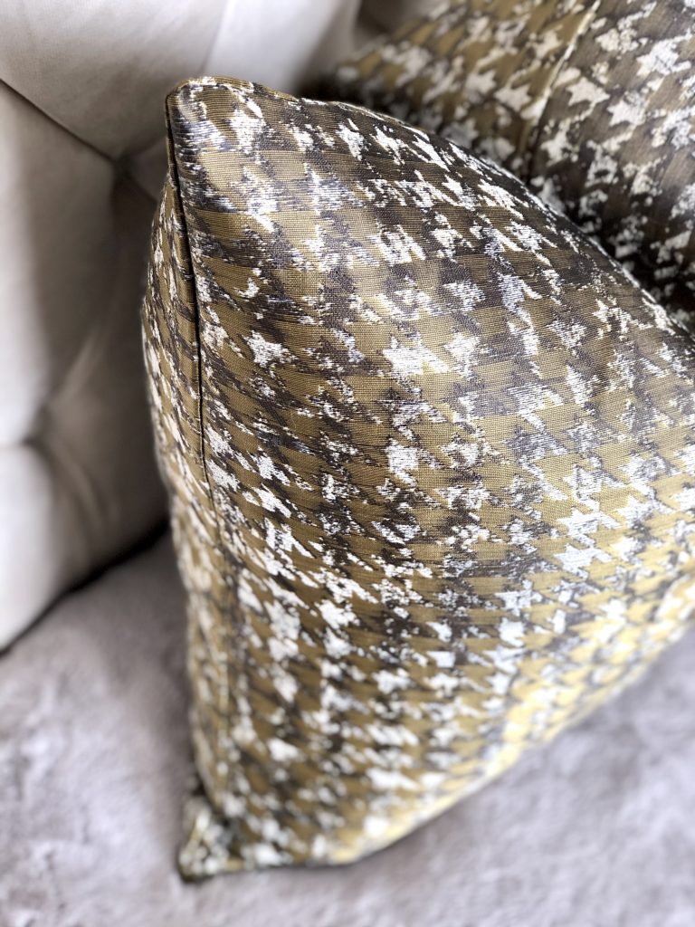 Ethna is a beautiful patterned cushion cover with a mix of colours: gold, brown, charcoal.