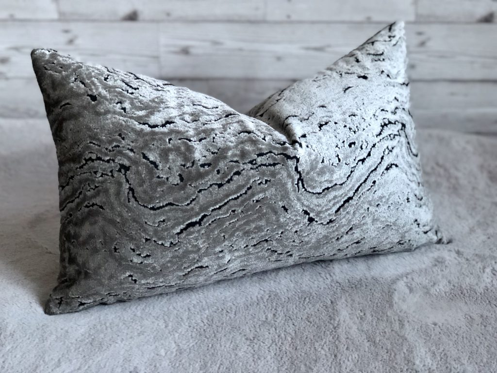 Elevate your space with Lava Junior, a stunning scatter cushion / throw pillow cover featuring a luxurious silver-and-black marble-textured velvet front with a subtle horizontal pattern. Its sleek, modern design adds depth, elegance, and a touch of glamour to any sofa, bed, or reading nook. Perfect for mixing and matching with your favourite decor pieces.