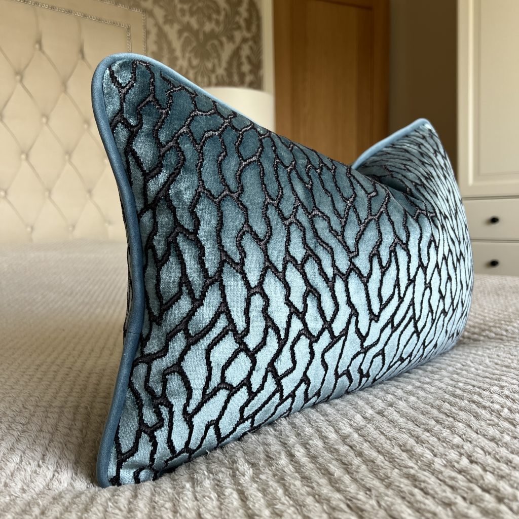 Romita Teal is a high end, luxury cushion cover with dark geometric, textured pattern on , finished up with teal velvet piping.